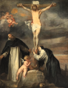 Son père François, qui, dans les années précédant sa mort en 1622, traversait une grave crise financière et souffrait de problèmes de santé, reçut des soins attentifs de la part de ces religieuses. En tenant une promesse faite par son père et par gratitude envers leur dévouement, Anthony fut don d’un tableau pour la chapelle de leur couvent. Dans cette œuvre, le Christ en croix est accompagné par les fondateurs de l’ordre, saint Dominique et Catherine de Sienne, que l’on reconnait à leurs habits noir et blanc.