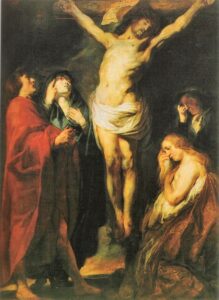 Christus aan het kruis’, als een van de centrale thema’s van het christelijke geloof, ontelbare malen gereproduceerd in de religieuze kunst. Trouw aan de evangeliën waarbij Jezus zijn moeder toevertrouwt aan de geliefde leerling staan Maria en Johannes onder het kruis. De barokschilders verlaten de middeleeuwse voorstelling: links – rechts als elkaars pendant. Nu staan ze beiden samen aan Jezus’ rechterzijde: dit benadrukt dat Maria voortaan Johannes als haar kind heeft opgenomen. De vraag van Jezus richt zich tot alle christengelovigen zich aan Maria als een moeder toe te vertrouwen.
