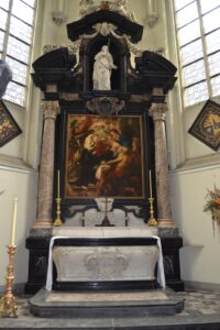 Door zijn woning aan de Wapper was dit zijn parochiekerk geworden: het jongste kind met Isabella Brant en alle vijf kinderen uit zijn tweede huwelijk werden hier boven de doopvont gehouden, een object dat overigens dateert uit 1624, dus echt uit Rubens’ tijd!